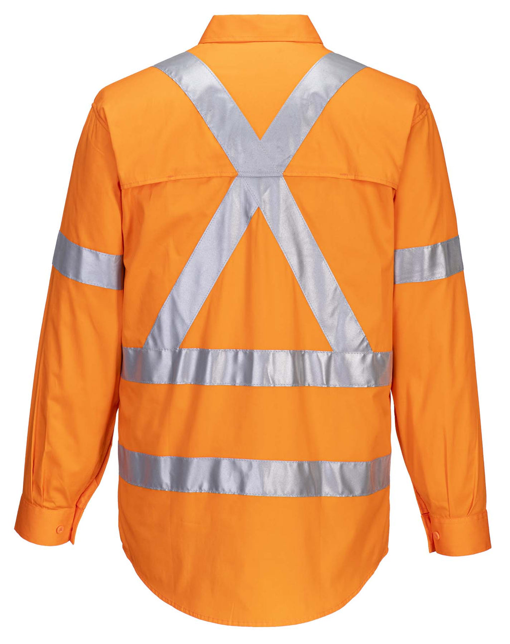 The Portwest Unisex X Back Reflective Taped Long Sleeve Hi Vis Shirt MX301 is a preshrunk Hi Vis Lightweight Shirt made from 100% cotton drill shirt with reflective tape. It also features underarm and back cool flow mesh, double breasted pockets with pen divisions, plastic button closure and gusset sleeves. The reflective tape in Cross Back Configuration.