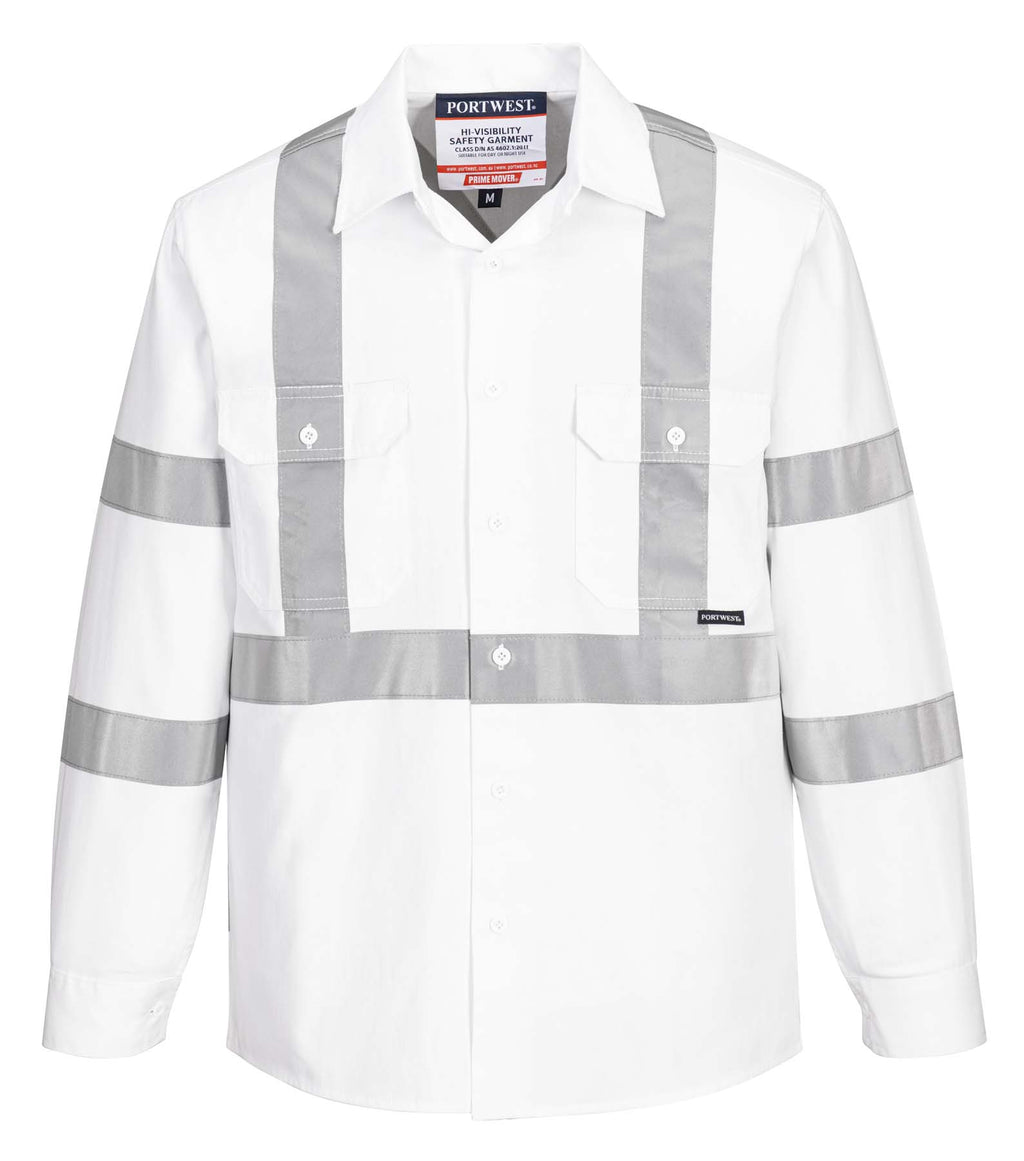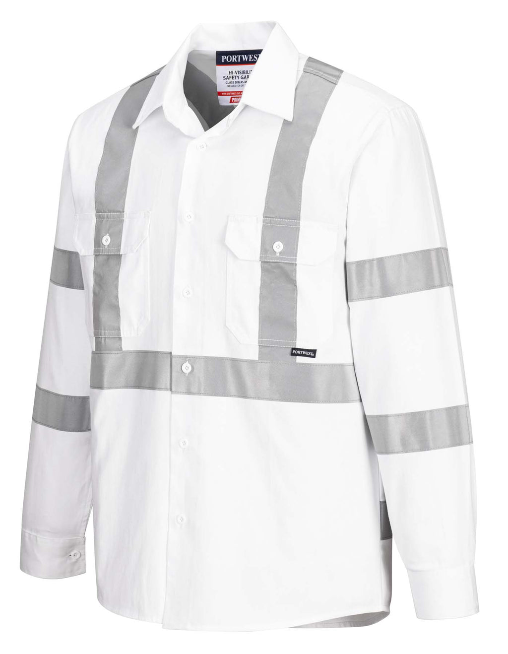 The Portwest Unisex X Back Reflective Taped Long Sleeve Hi Vis Shirt MX303 is a White cotton drill shirt with reflective tape designed for night time wear and is a great choice in the White Workwear for Night Work range. This shirt features underarm and back mesh for a cool air flow. It also has double breasted pockets with pen division, gusset sleeves and button closure. The Hi is Reflective Tape is in a cross back configuration.