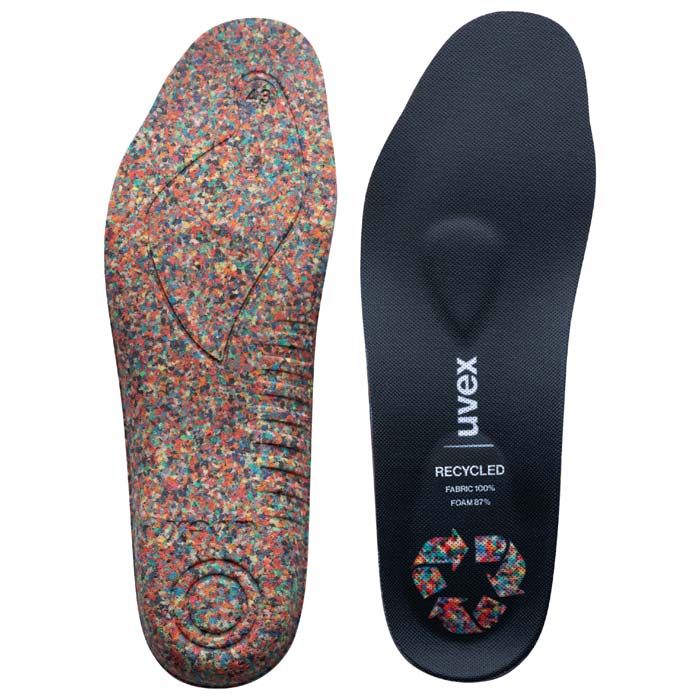 - uvex x-flow safety footwear range footbed is made from 87% recycled production waste foam and the top cover fabric is made from 100% recycled PET plastic.